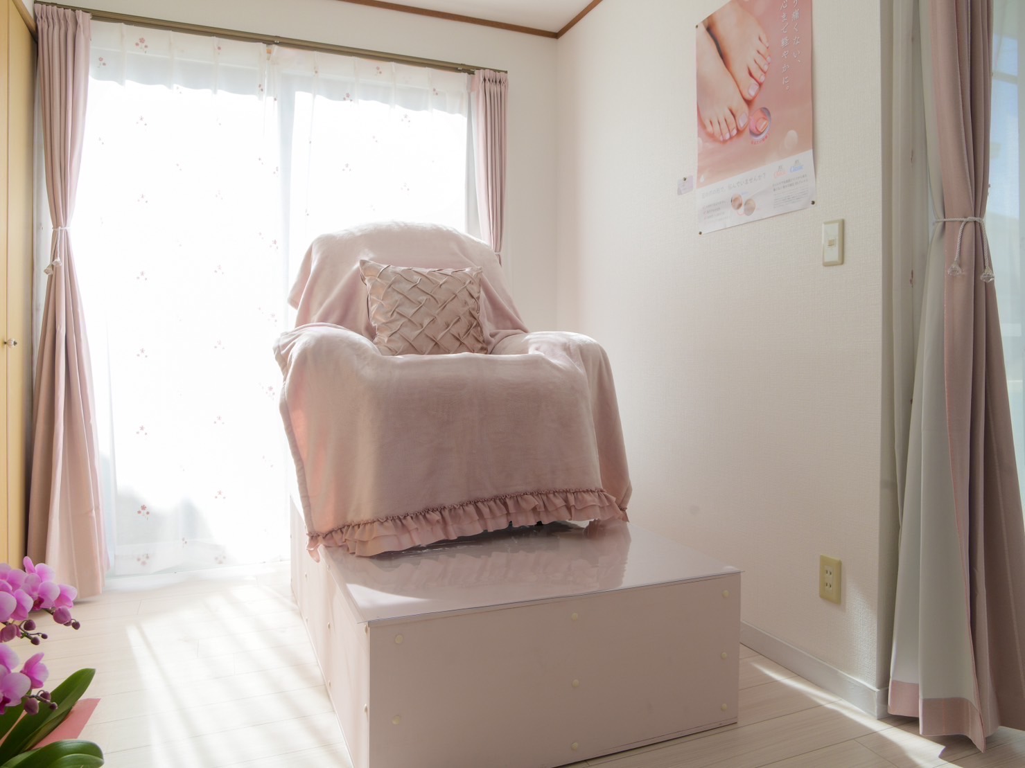 制作に関しては、「“プライベートおうちサロンの安心感”と、“ときめき(大人かわいい)”が同時に伝わること」を軸に、ピンク×白の世界観と余白感で、やさしく上品なトーンにまとめました。ファーストビューでは「しあわせを感じるひとときを」というメッセージを中心に据え、写真と一緒に“サロンの空気感”が3秒で伝わる導入にしています。